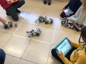 Utilizando el kit LEGO Mindstorms EV3, han construido un coche y aprendido a programarlos controlando la potencia y dirección del mismo. El objetivo final ha sido hacer una batalla de robots en un ring hecho en el suelo, en el que compitiendo dos a dos, gana el robot que consigue sacar del ring o derribar a su contrincante.